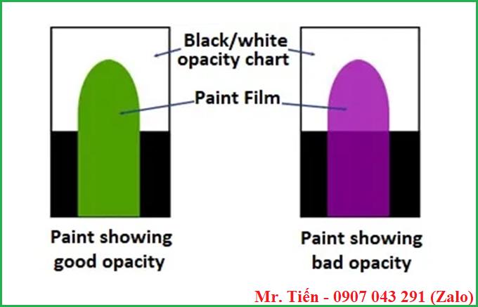 – Sơn có độ mờ đục cao sẽ che khuất các vùng màu đen và trắng ở mức độ tương đương. Trong trường hợp này, lượng ánh sáng được phản xạ lại từ các vùng màu đen và vùng màu trắng sẽ gần bằng nhau. Do đó độ che phủ sẽ đạt 100%.