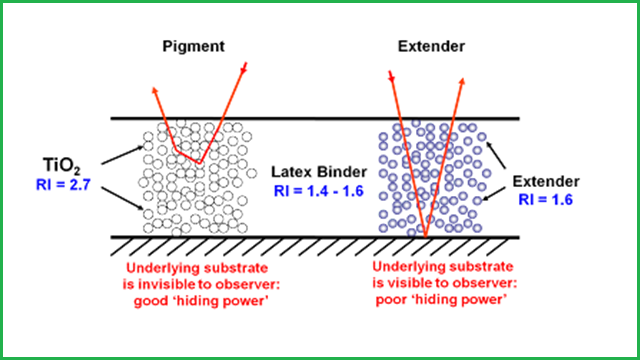 – Một yếu tố quan trọng quyết định độ mờ đục của sơn là chiết suất của bột màu. Thông thường, chất kết dính latex có chiết suất khoảng 1.4 – 1.6, và khi chiết suất của bột màu càng cao, hiệu ứng làm mờ càng tăng.